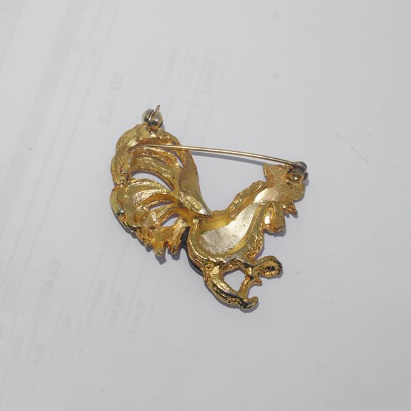Spilla di un gallo in metallo dorato, smalti policromi e strass