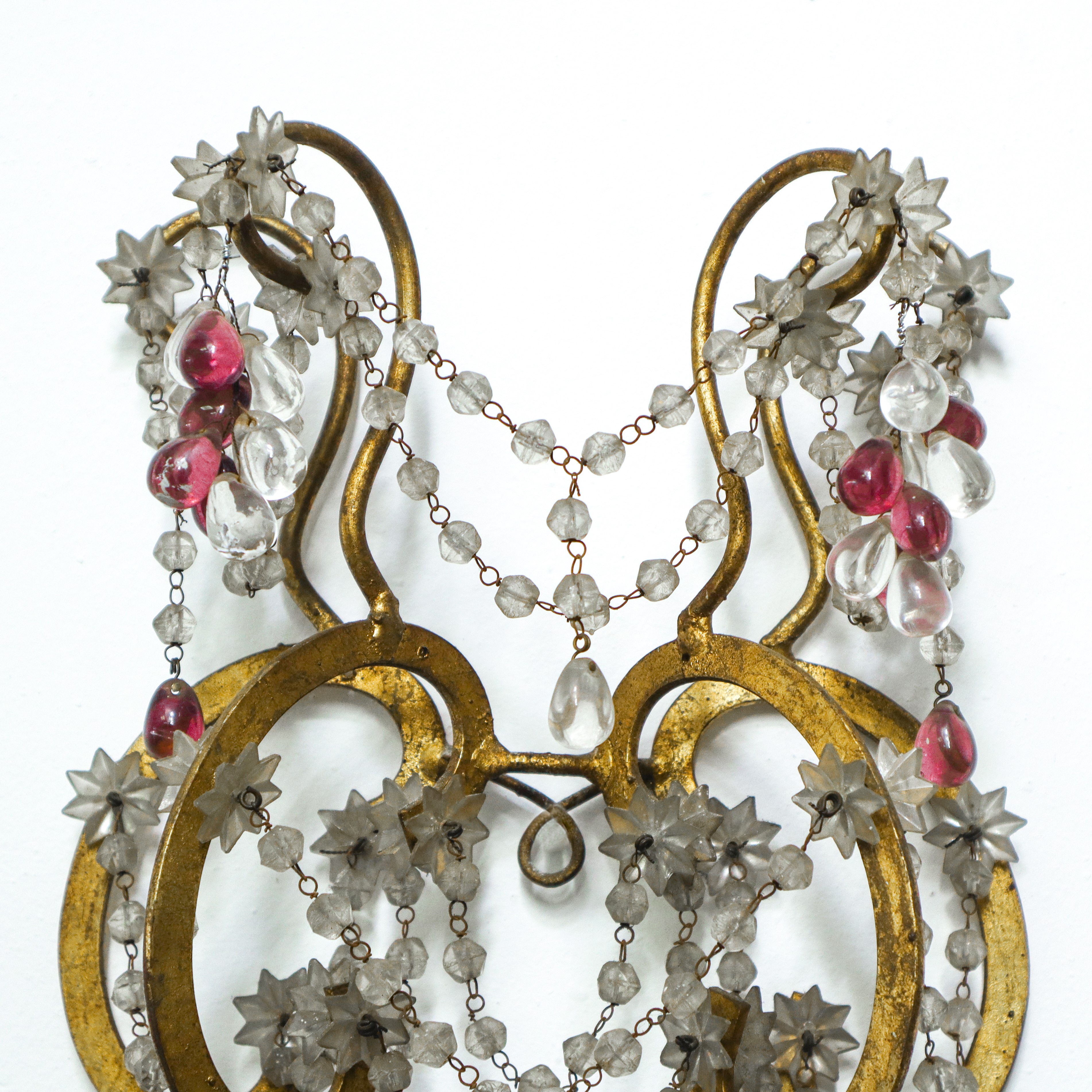 Applique in metallo dorato con brindoli in vetro a sfere e fiori bianchi e ametista a tre luci