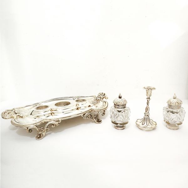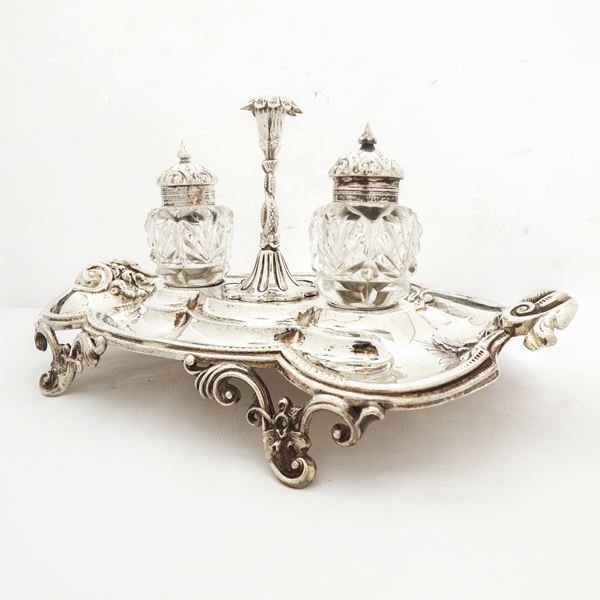 Composto da: supporto, contenitori per inchiostro in vetro con tappo in sheffield e porta pennino