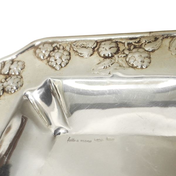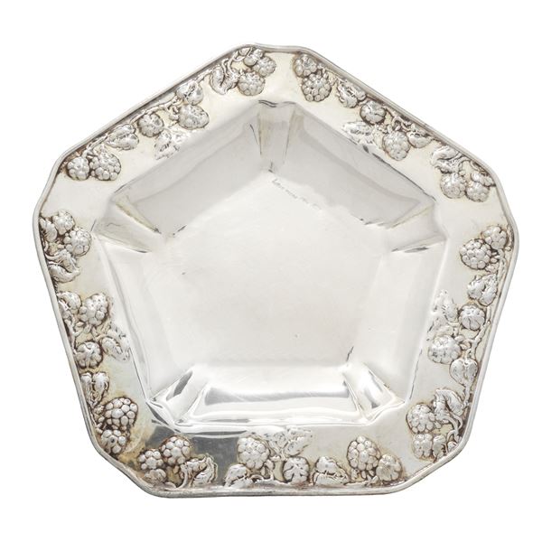 Piccolo piatto pentagonale in argento 800 con decori a sbalzo di foglie e lamponi