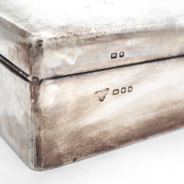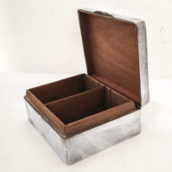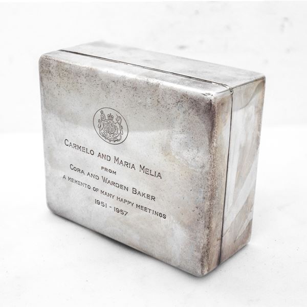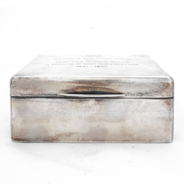 Scatola rivestita in argento con iniziali e scritta commemorativa