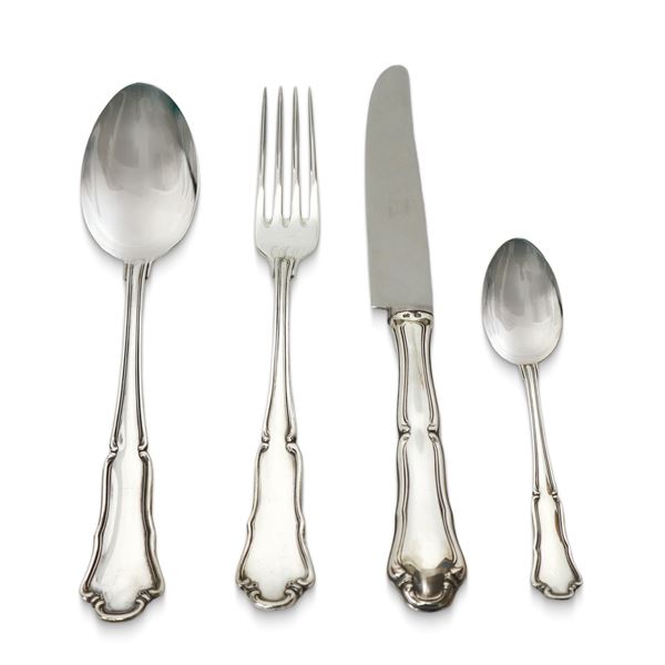 Composto da : 6 cucchiai (348 gr), 6 forchette ( 346 gr) , 6 coltelli, 6 cucchiaini ( 96 gr)