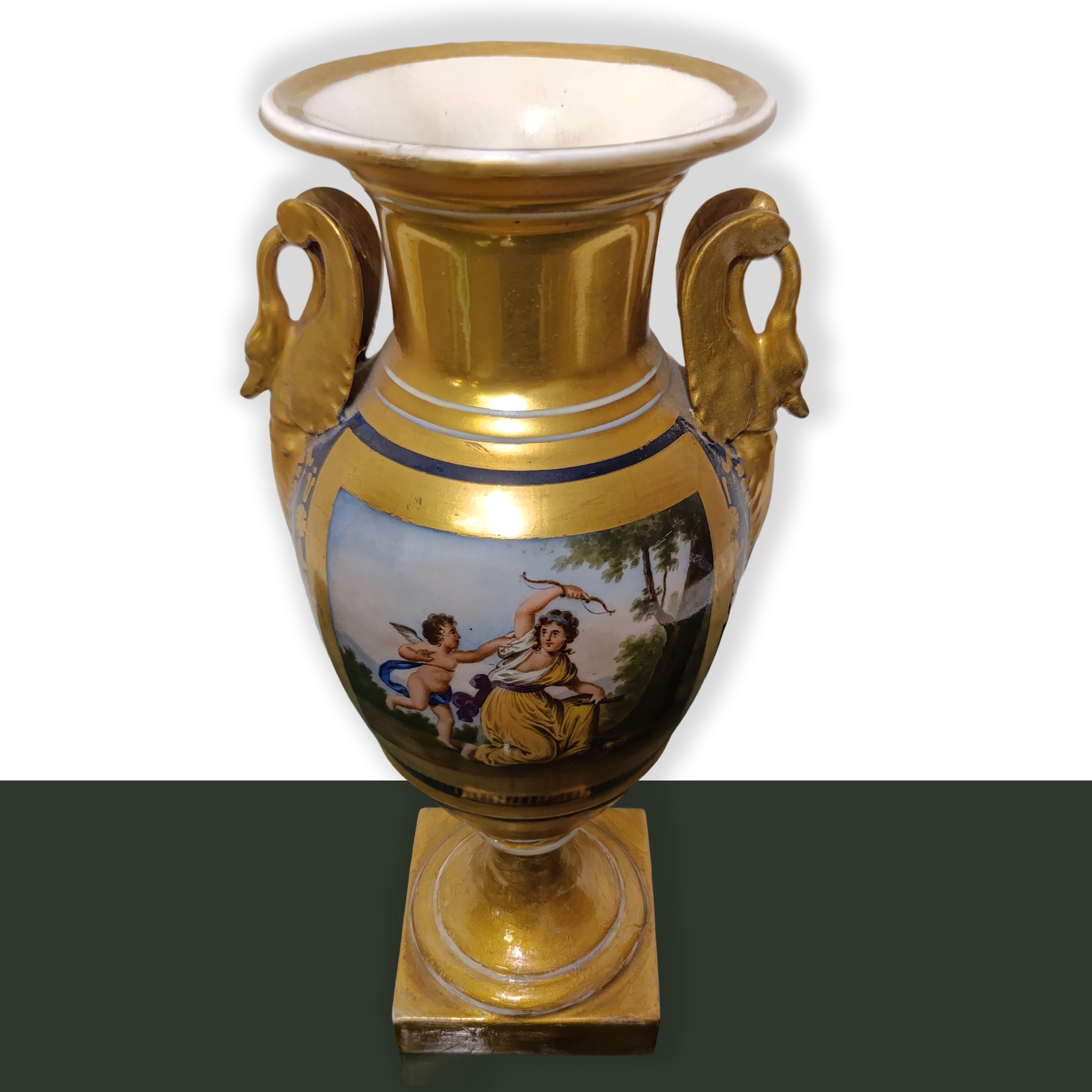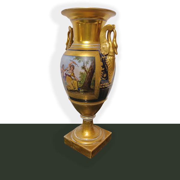 Scene di genere sul fronte , decori floreali in oro al retro. Presenti restauri alla base di uno e minime mancanze.