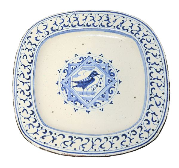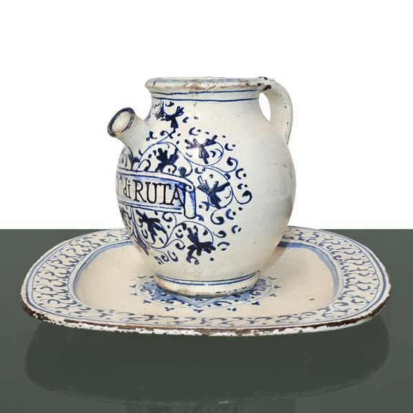 Piatto e versatoio in maiolica Deruta decorati a motivi a foglie, inizi XX secolo