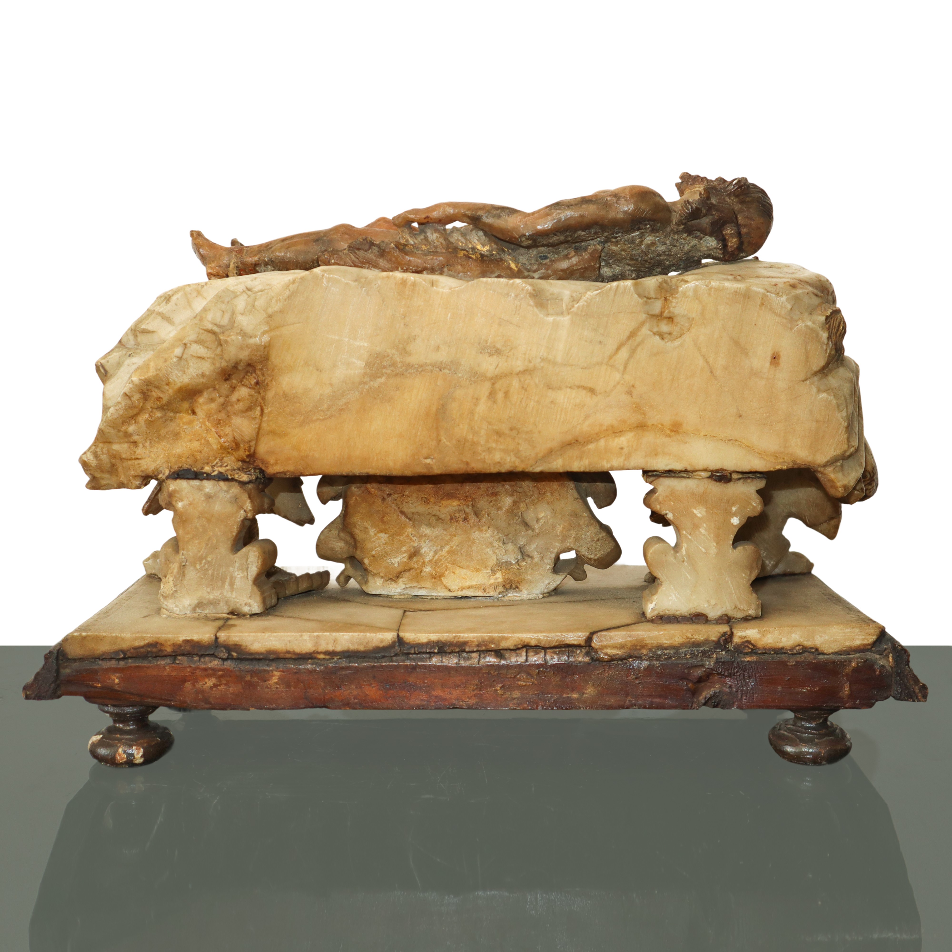 Scultura della deposizione di Cristo su base con aquile in alabastro e in alabastro rosa di Trapani, XVI secolo