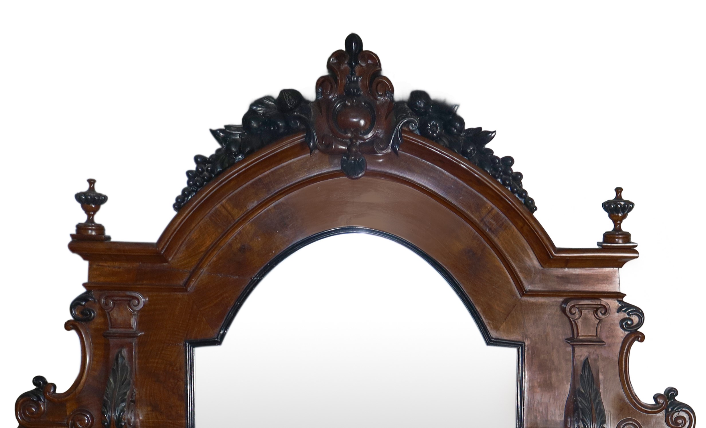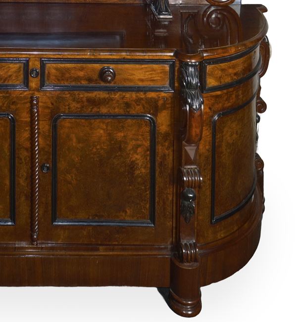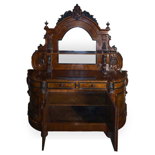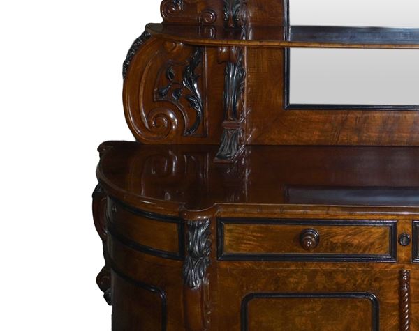 Grande piattaia in noce e radica con alzata a specchio Luigi Filippo, sculture e intagli applicati, Francia XIX secolo