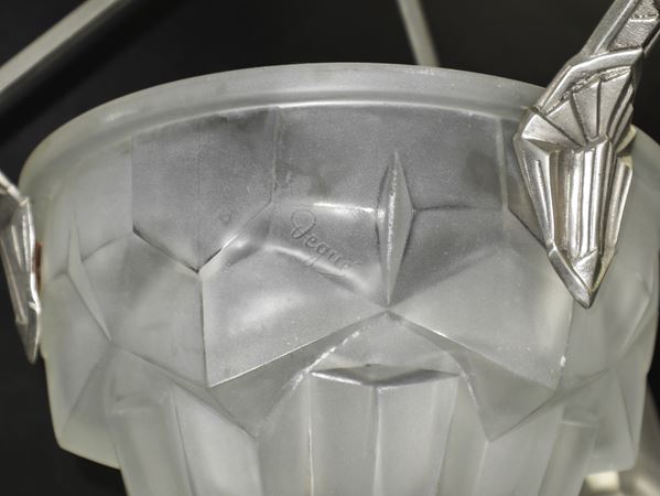 Lampadario a sospensione Art Decò francese, in vetro sabbiato con geometrie, Anni 30