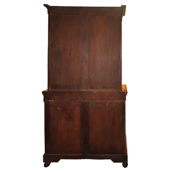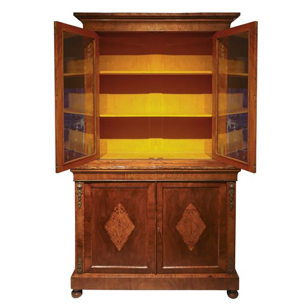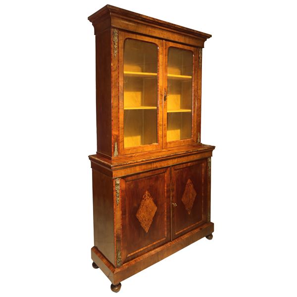 Libreria-credenza in legno di noce a due corpi con sportelli a vetri nella parte superiore e coppia di sportelli nella parte bassa con intarsi in legni chiari e bronzi applicati, Sicilia XIX secolo