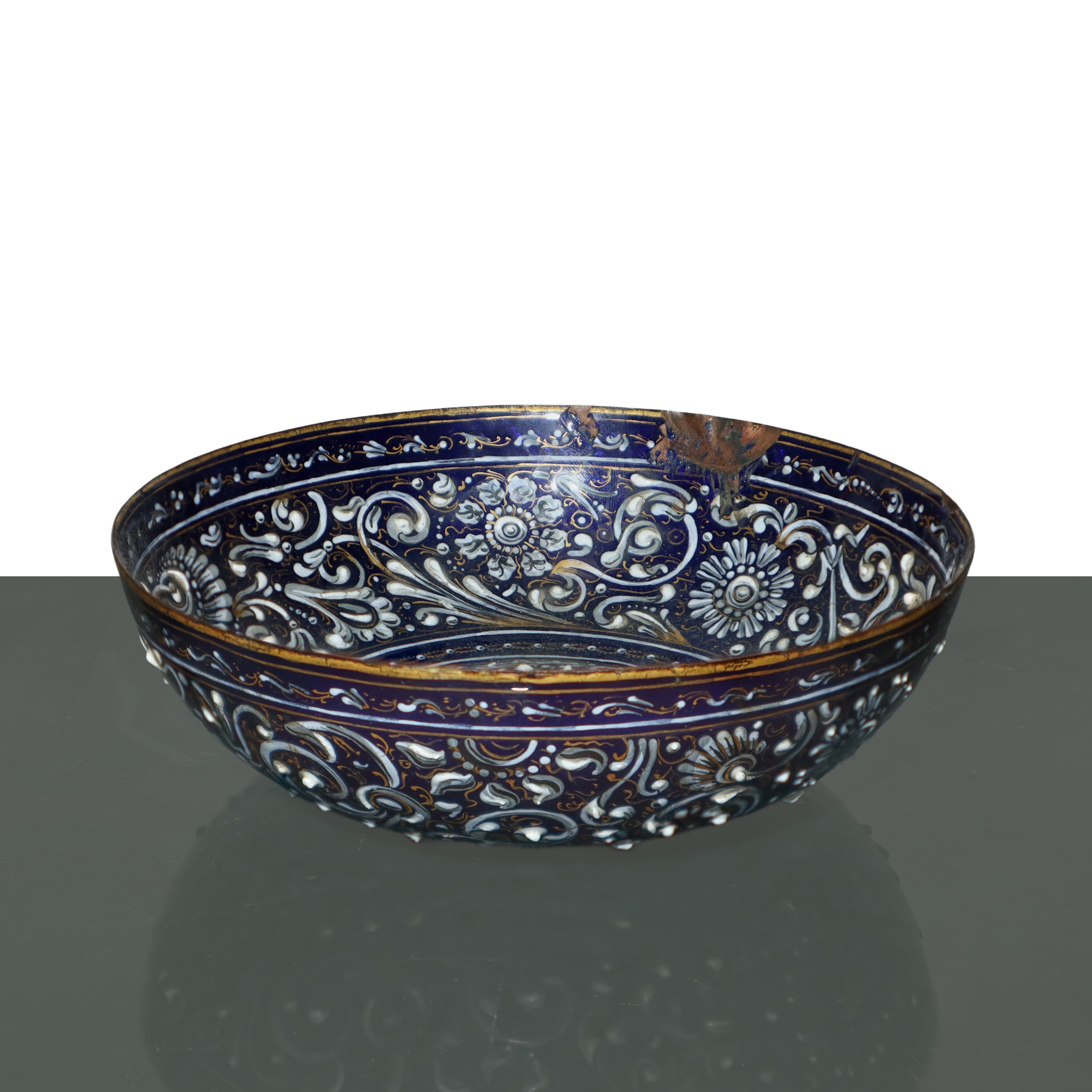 Ciotola a motivi rinascimentali con smalti di sottili fili d'oro su base blu e smalti floreali bianchi applicati su rame, XVI secolo
