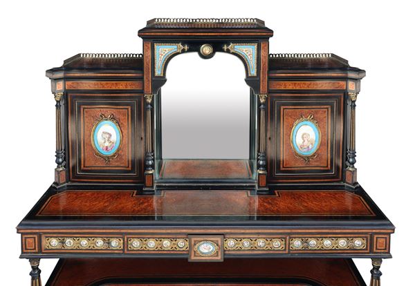 Porcellane alla maniera di Sevres applicate agli sportelli e al bordo del piano. Modenature in ottone applicate. Specchio centrale.