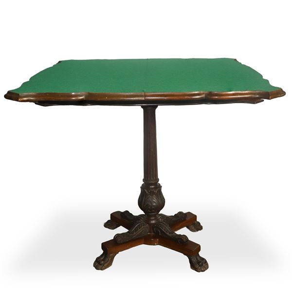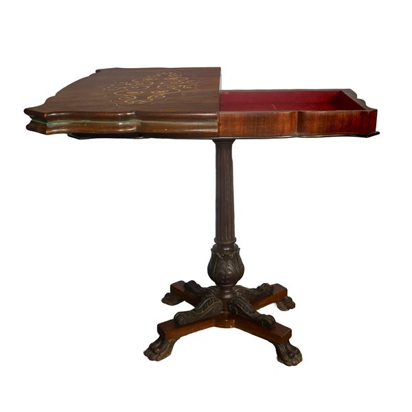 Tavolo da gioco in legno di palissandro con intarsi chiari al piano e piede a 4 razze, XIX secolo