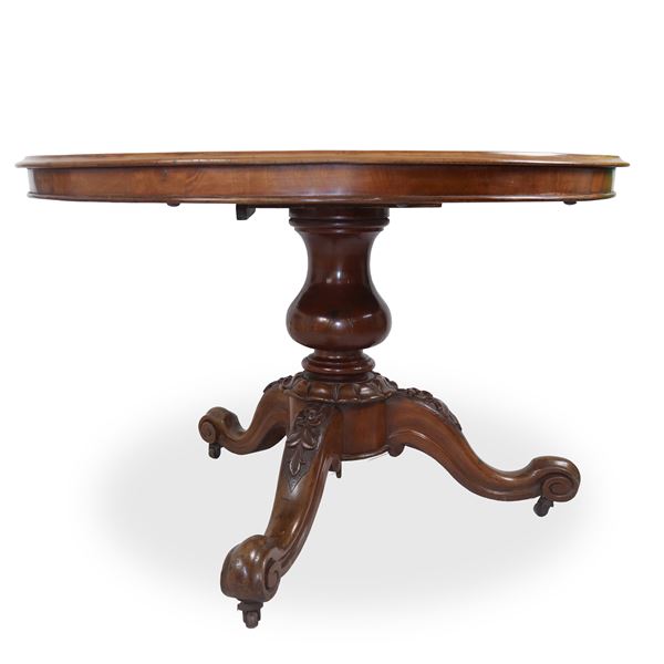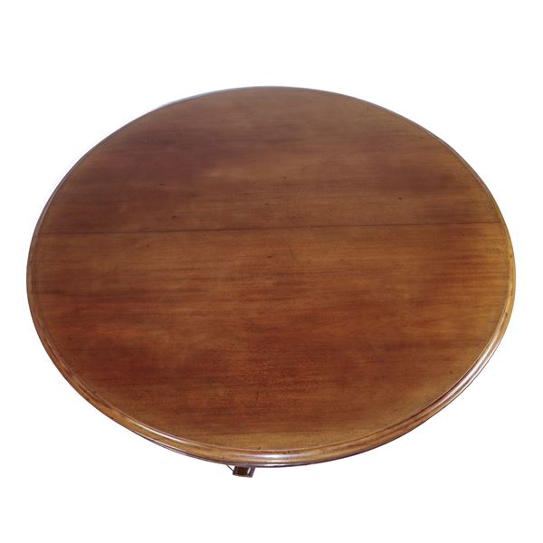 Tavolo da pranzo allungabile rotondo in legno di mogano piede a tre razze intagliato e scolpito a foglie, XIX secolo