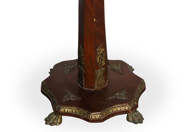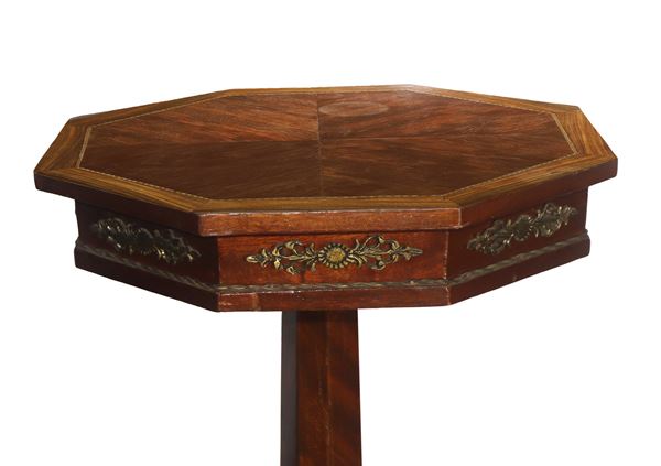 Con sostegno a colonna esagonale piano ottagonale filettato in legno di mogano ai bordi e in noce chiara al centro. Sottopiano e base con bronzi applicati