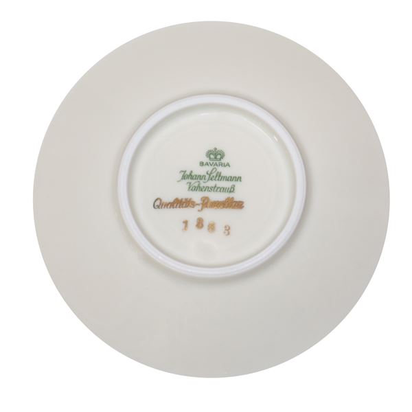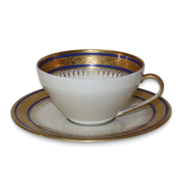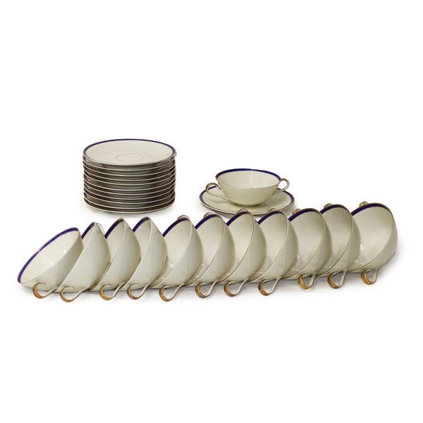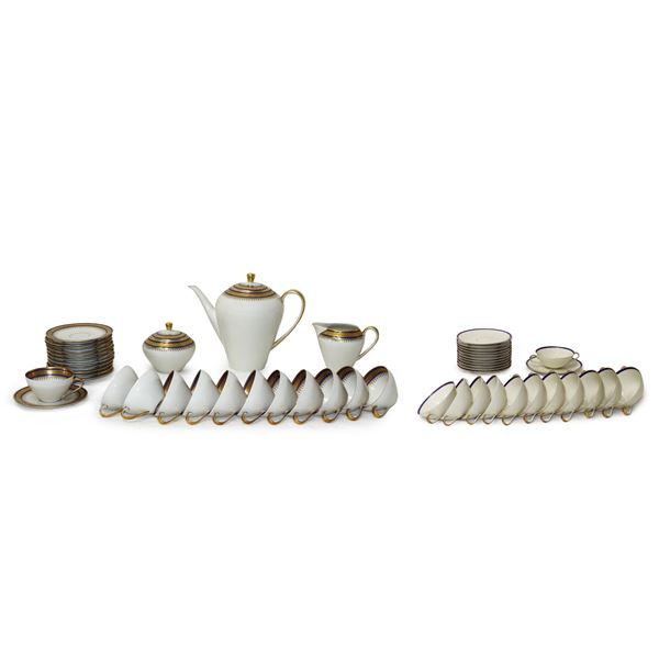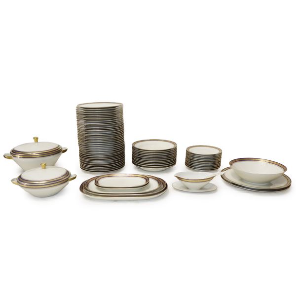 Composto da 24 piatti tondi piani, 12 piatti da primo, 3 vassoi ovali, 2 piatti tondi, 12 piattini per tazzine, 12 tazzine da caffe', 2 piatti tondi grandi, 1 zuppiera grande, 1 zuppiera piccola, 2 piatti piccoli ovali, 1 teiera con piatto, 1 lattiera, 1 zuccheriera, 1 salsiera e 1 insalatiera, 11 piattini piccoli da dolce, 12 tazze da brodo, 12 piattini. Minima filatura su un piatto fondo.