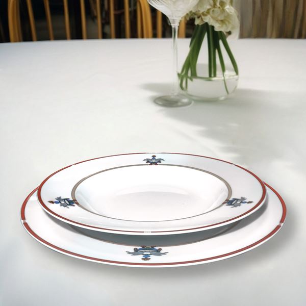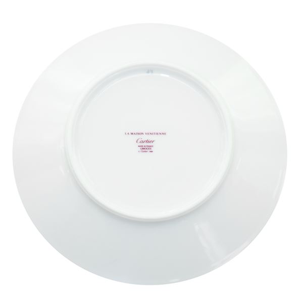 Composto da : 24 piatti piani, 12 piatti fondi, 12 piatti dolce, 12 piattini pane, 1 zuppiera, 1 piatto da portata ovale, 1 piatto da portata rotondo, 1 salsiera, servizio da the e caffè : 12 tazze da the con piattino, 12 tazzine da caffe con piattino, teiera, lattiera e zuccheriera . Sul retro marchio della manifattura Cartier. Mai usato in scatola originale.