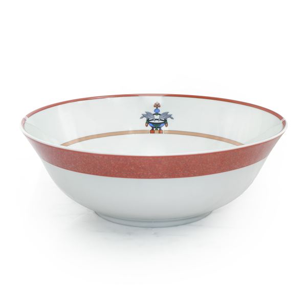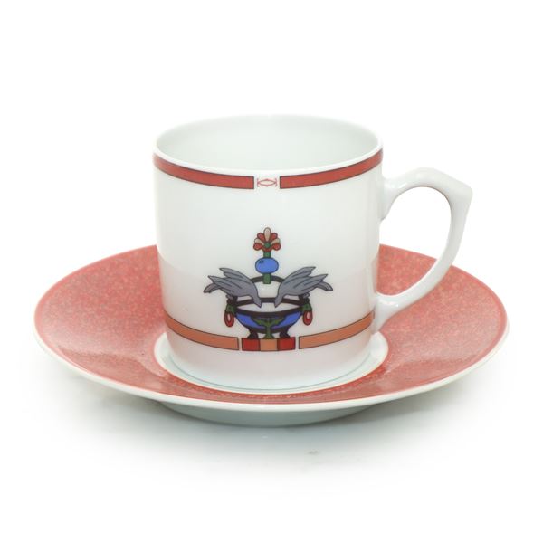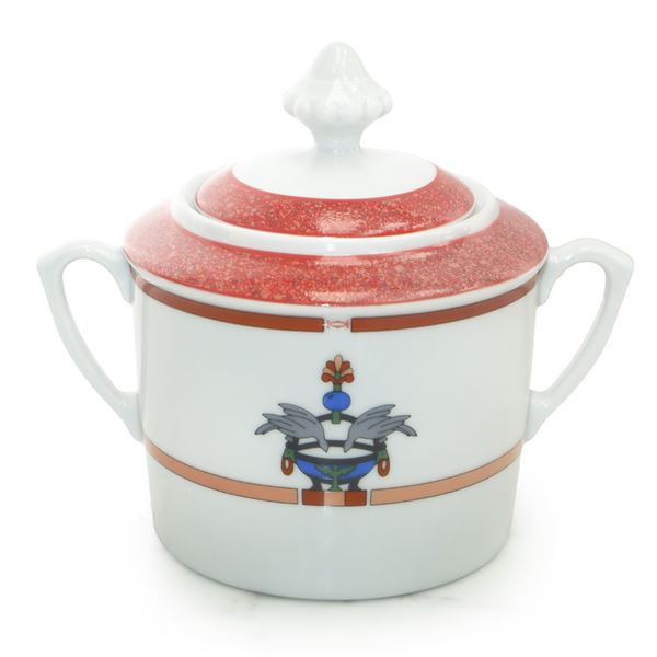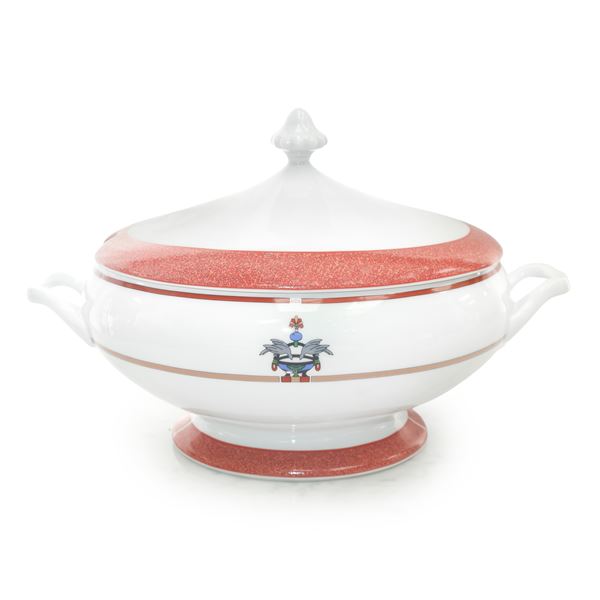 Completissimo servizio in porcellana di Limoges bianca e corallo La Maison Venitienne, con decoro centrale in smalti policromi raffigurante due colombe.