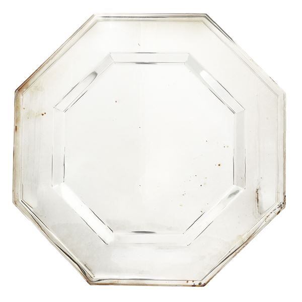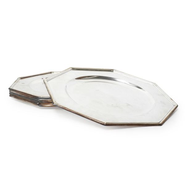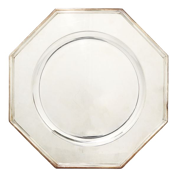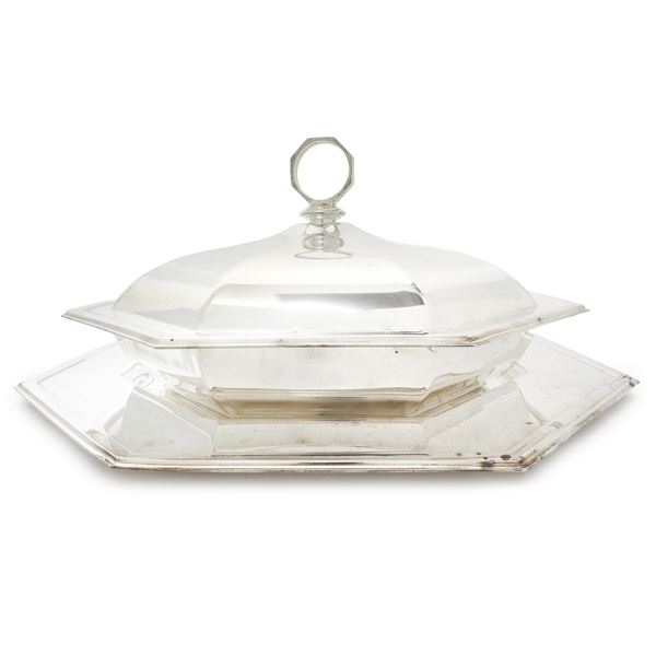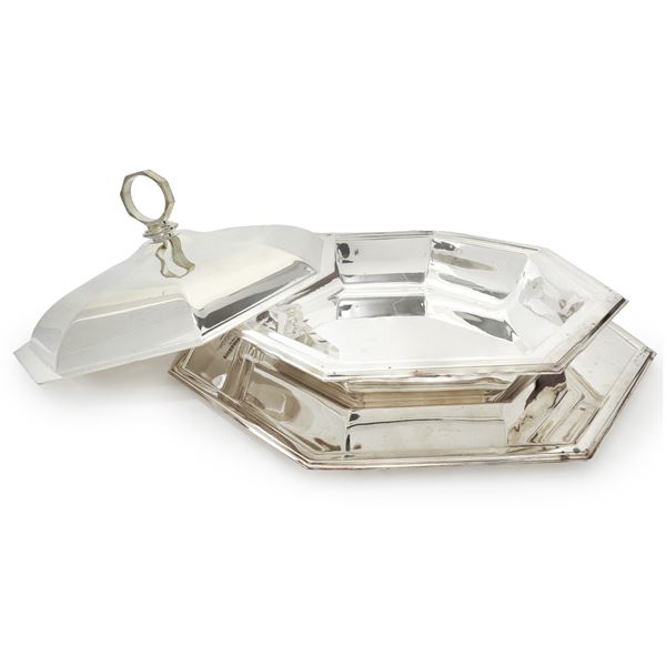 Zuppiera ottagonale con vassoio e 6 sottopiatti, silver plated.
