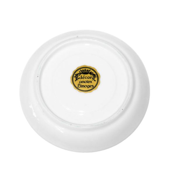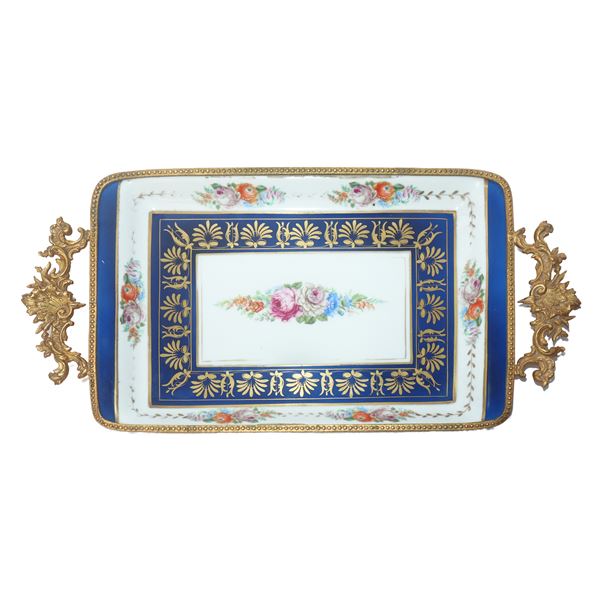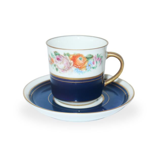 Tête-à-tête con vassoietto e due tazze con decori in blu a motivi floreali con smalti e dorature, XX secolo