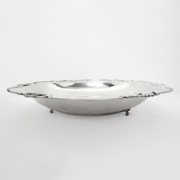 Portadolci in argento 800 con bordo smerlato e piedi di sostegno decorati