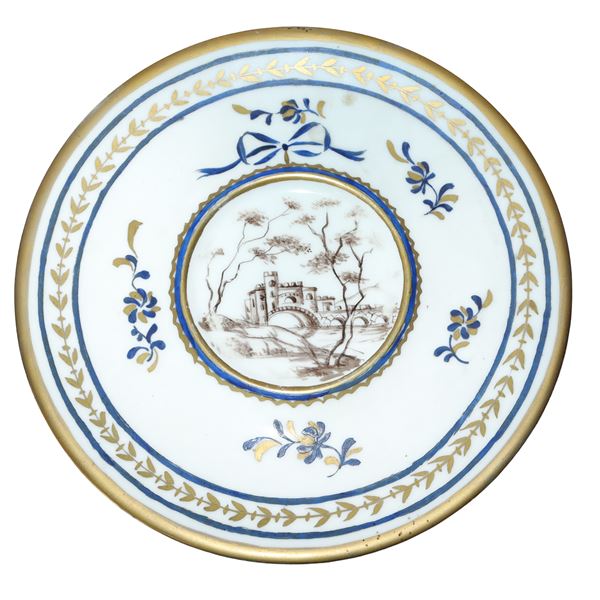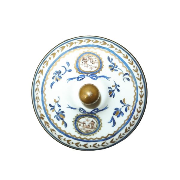 Tazza con coperchio e piattino decorata e invetriata in porcellana nei toni del blu e del manganese con paesaggi