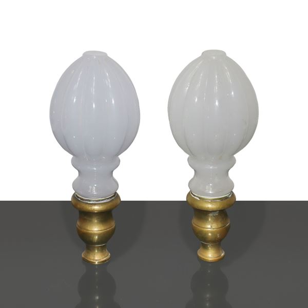 Coppia di pomoli da letto in vetro di Murano lattimo e ottone dorato