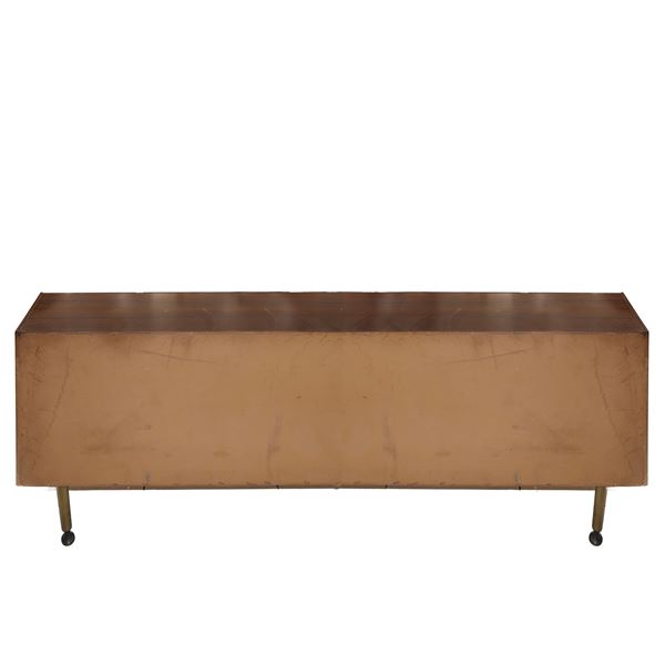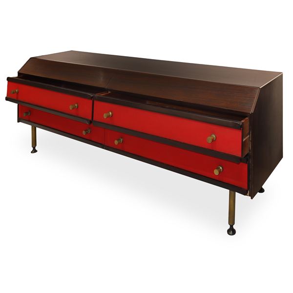 Cassettiera in legno di palissandro con riporti in tessuto rosso e pomelli e piedi in ottone, anni '60