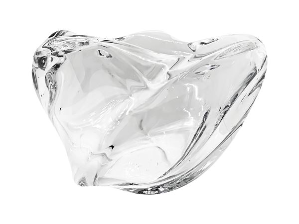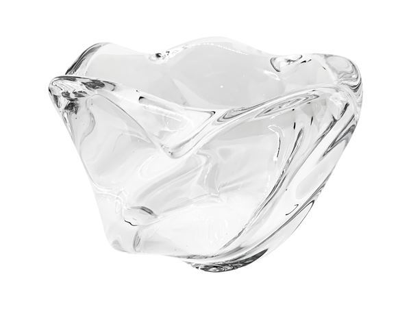Coppa in vetro trasparente di forma circolare con costolature a rilievo lungo la superfice.