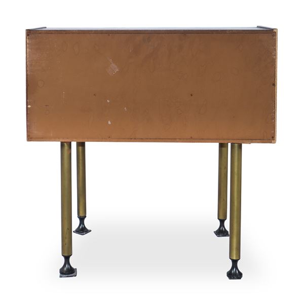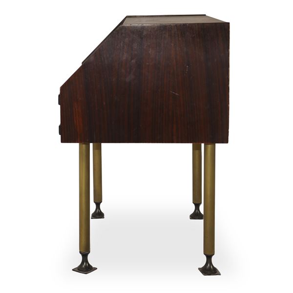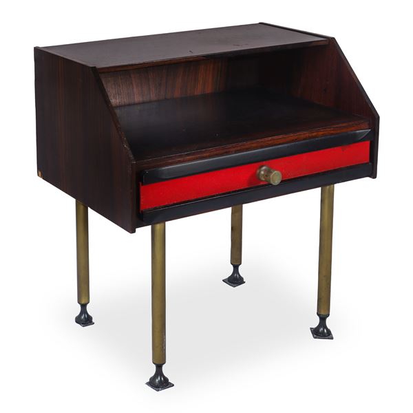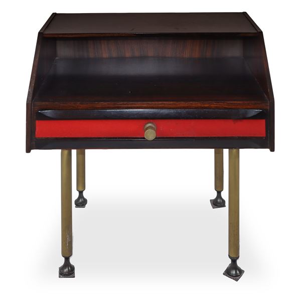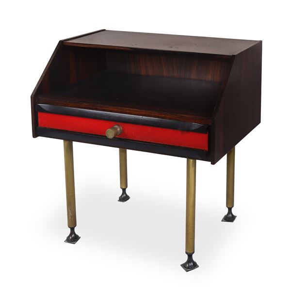 Coppia di comodini in legno di palissandro con riporti in tessuto rosso e pomelli e piedi in ottone, anni '60