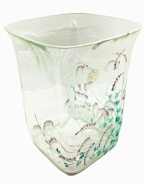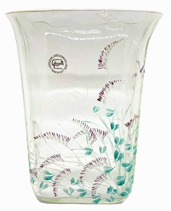 Vaso in vetro trasparente di forma rettangolare con decori floreali