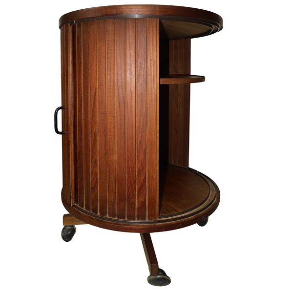 Mobile bar, girevole in teak con serranda scorrevole piede a quattro razze con rotelle
