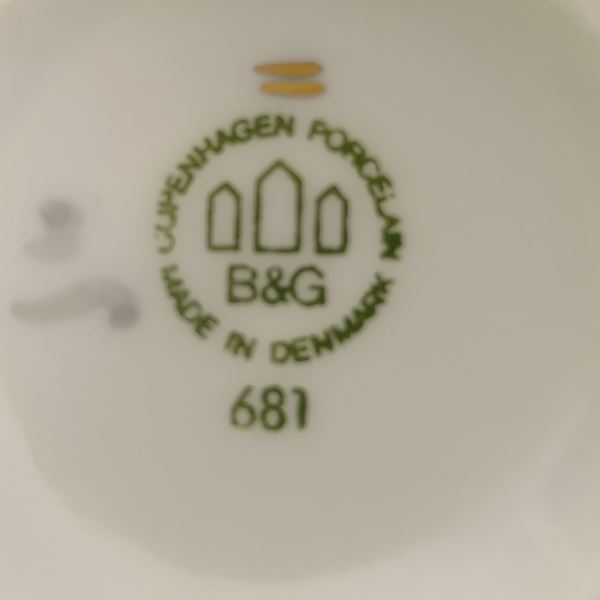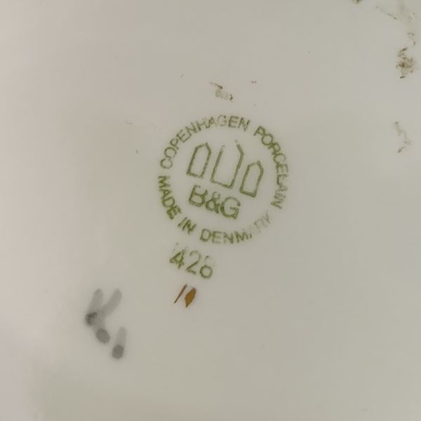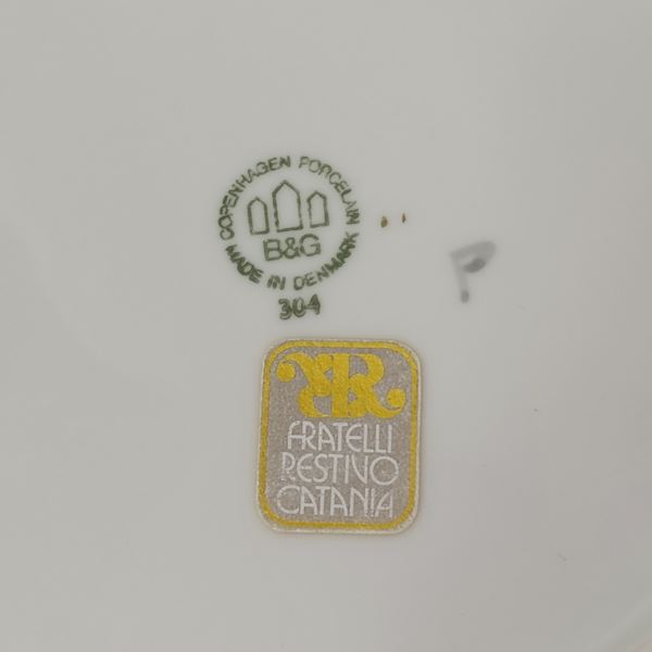 Gruppo composto da: un piccolo vaso, una alzata , un vassoio e una ciotola. L'alzata presenta una piccola sbeccatura sul bordo dorato.
