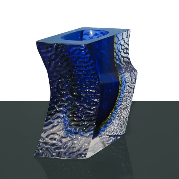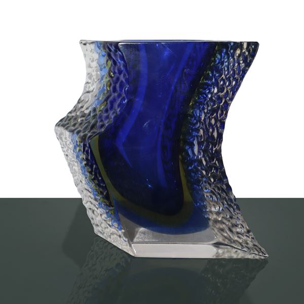 Vaso in vetro sommerso blu con iridescenze interne nei toni del giallo, XX secolo
