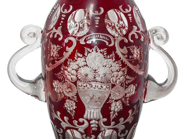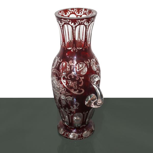 Vaso intagliato e colorato rosso in vetro di Boemia con manici