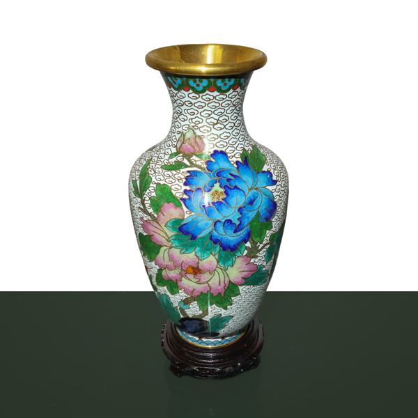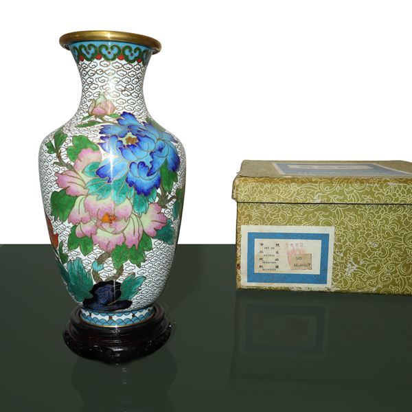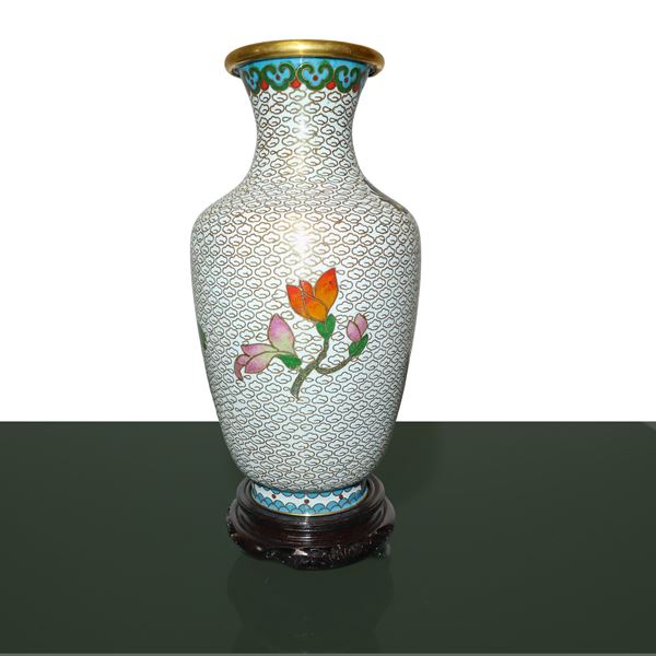 Coppia di vasi cloisonnet con fondo bianco e decori floreali con base in legno