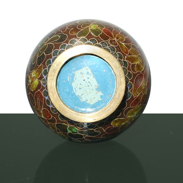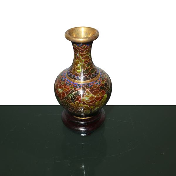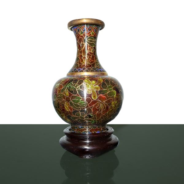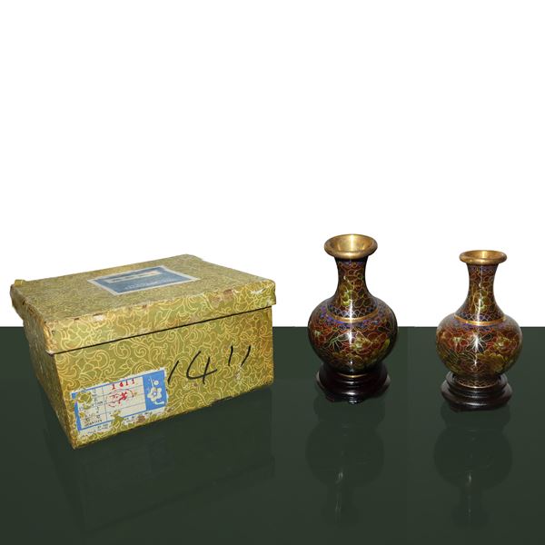 Coppia di vasi cloisonnet nei toni del marrone con base in legno