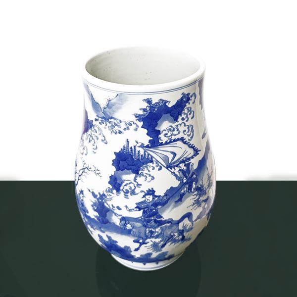 Grande vaso cinese bianco e blu con scene di guerra, Dinastia Qing XVIII/XIX secolo