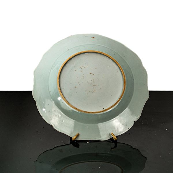 Piatto in porcellana con scena familiare dipinta famille Rose, XVIII secolo