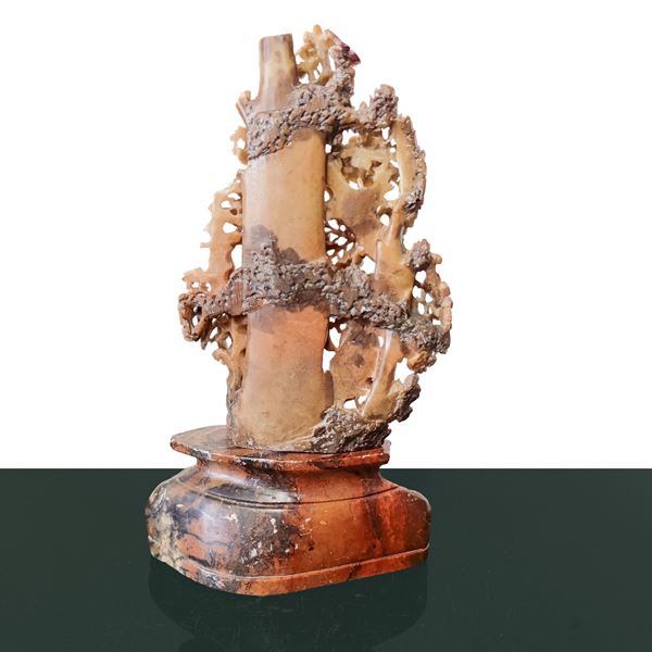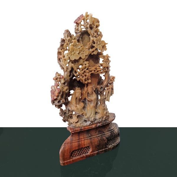 Scultura cinese in pietra saponaria con vecchi saggi e fiori