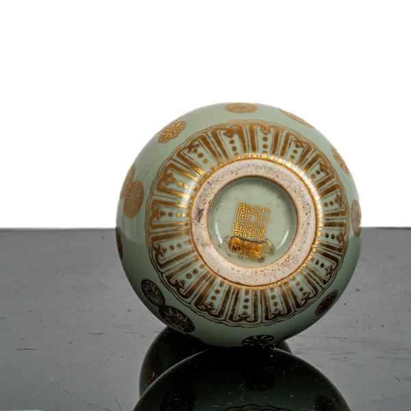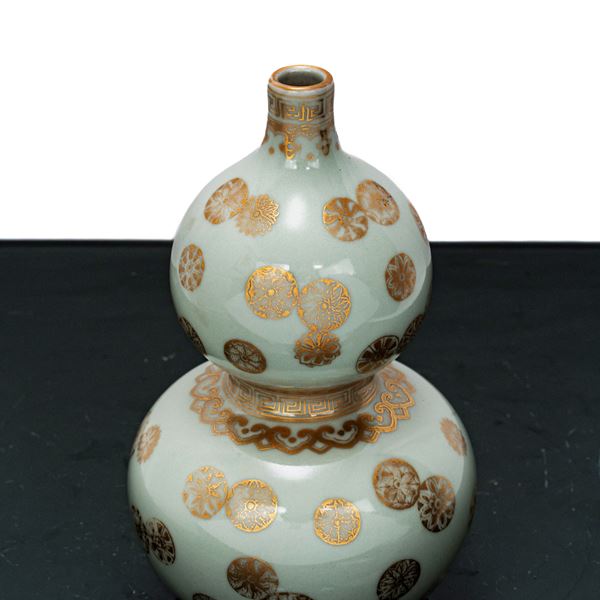 Vaso a doppia zucca in porcellana celadon con motivi decorativi dorati, dinastia Qing periodo Qianlong