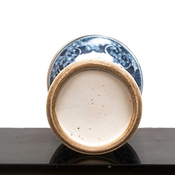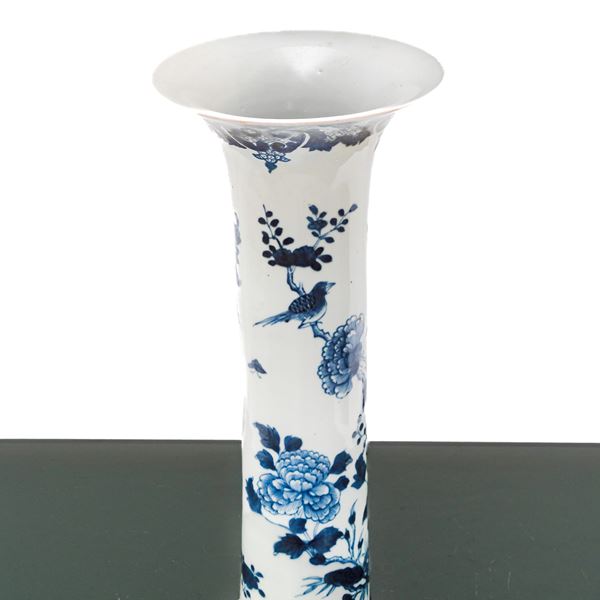Vaso blu e bianco con decori di fiori e uccelli