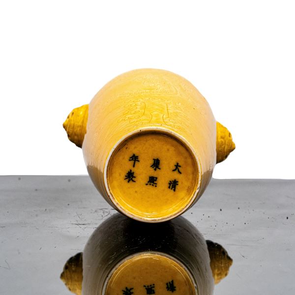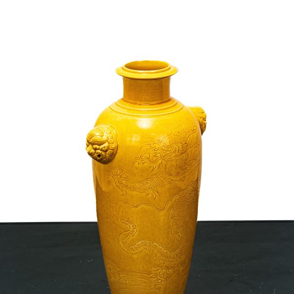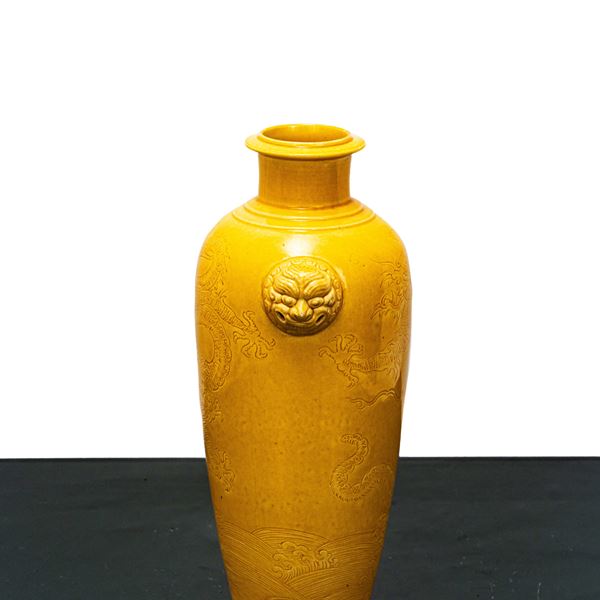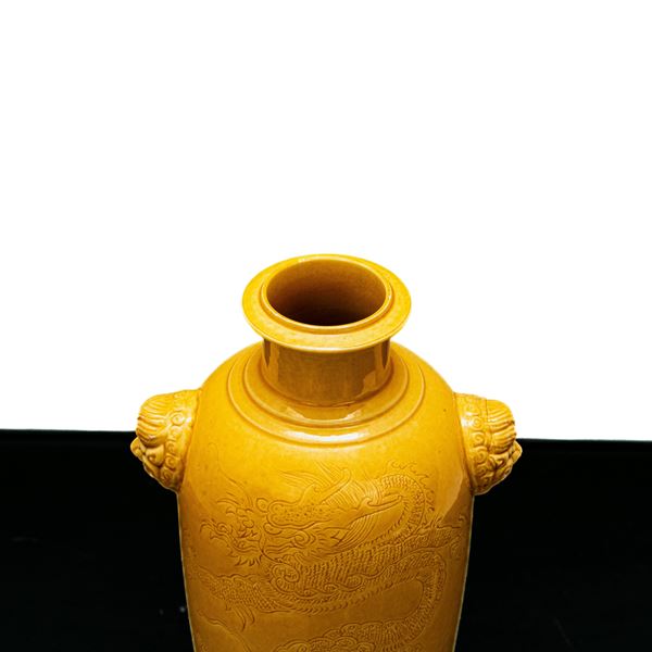 Vaso giallo con inciso motico decorativo con dragoni, Dinastia Qing