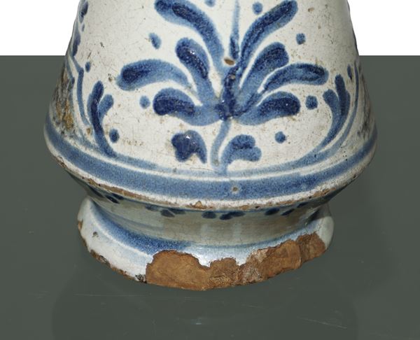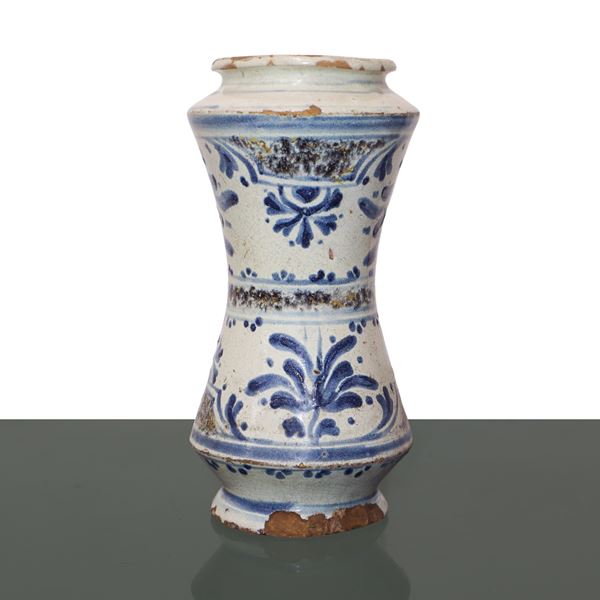 Albarello in maiolica di Caltagirone decorata a mano nei toni blu e manganese a motivi floreali, XVIII secolo