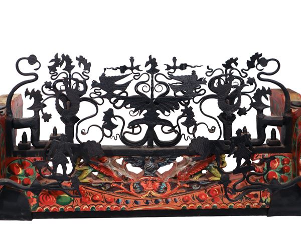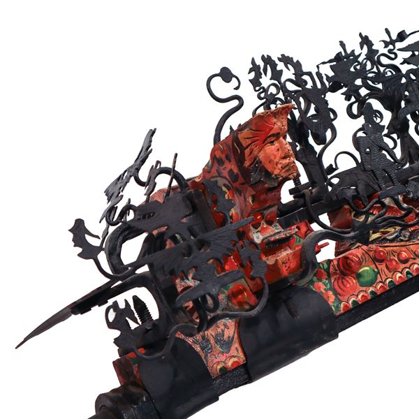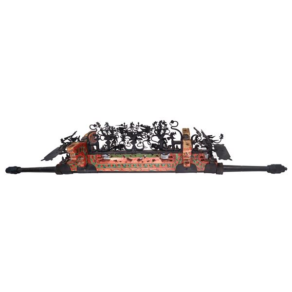 Frammento di carretto, cascia di fusu, in legno scolpito e dipinto con ferro forgiato in stile barocco con figurazioni