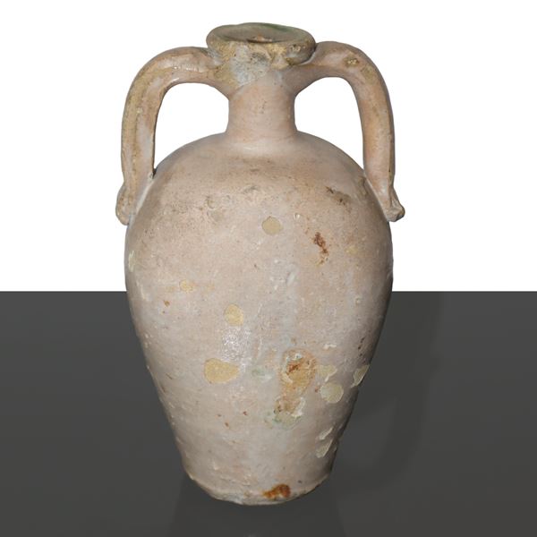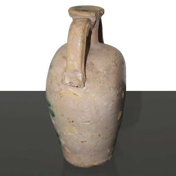 Piccola quartara in maiolica policroma di Caltagirone con manici e decorazioni di fiori e foglie, XIX / XX secolo