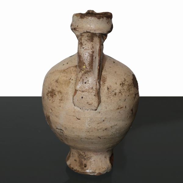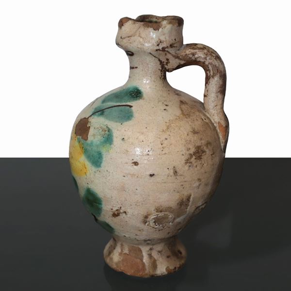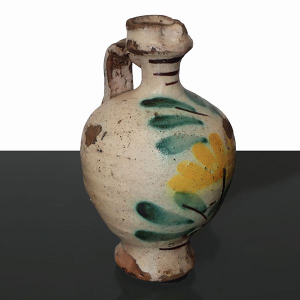 Piccolo versatoio in ceramica policroma di Caltagirone, smaltato con decorazioni di fiori con foglie. Cadute di colore, XIX / XX secolo