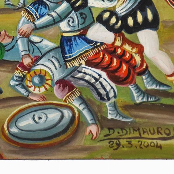 Scena di combattimento tra Paladini e Saraceni, firmata Domenico Di Mauro, Tavoletta dipinta a olio