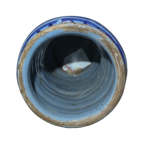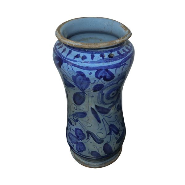 Albarello in maiolica di Caltagirone invetriato e decorato a motivi floreali nei toni del blu e celeste ispirazione Savona, XVII secolo