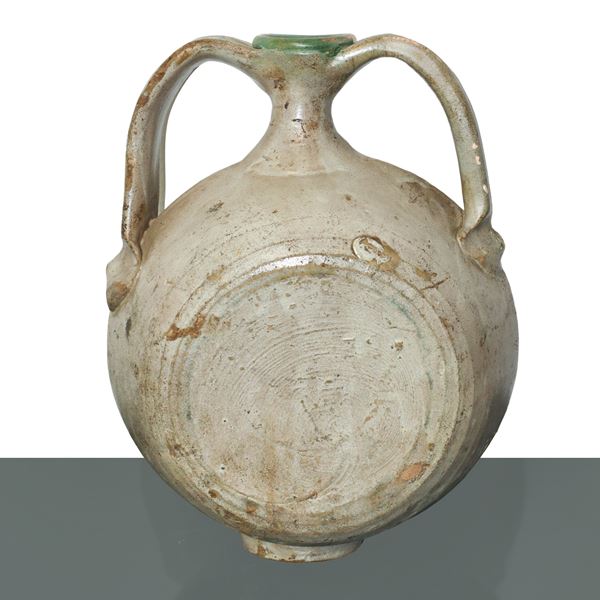 Borraccia in maiolica di Caltagirone dipinta policroma con casa sul fronte, XIX secolo