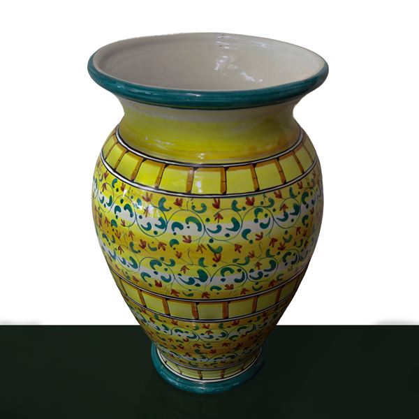 GRANDE VASO IN MAIOLICA DI CALTAGIRONE DIPINTA POLICROMA A FIORI E FOGLIE SU BASE GIALLA