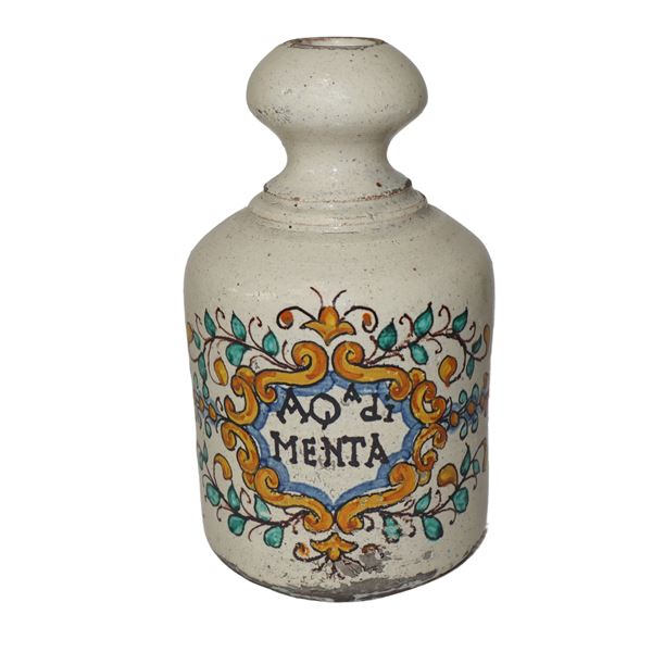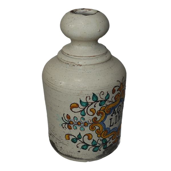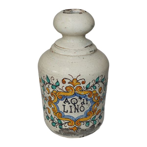 Coppia di bottiglie da farmacia, acqua di lino ed acqua di menta, XX secolo